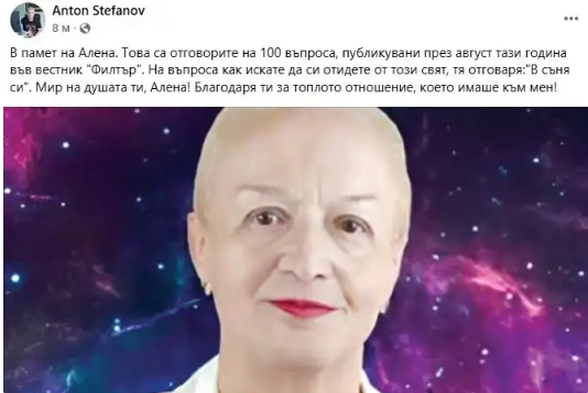 Мир на душата ти, Алена! Благодаря ти за топлото отношение, което имаше към мен!” – сподели Стефанов в личния си фейсбук профил.