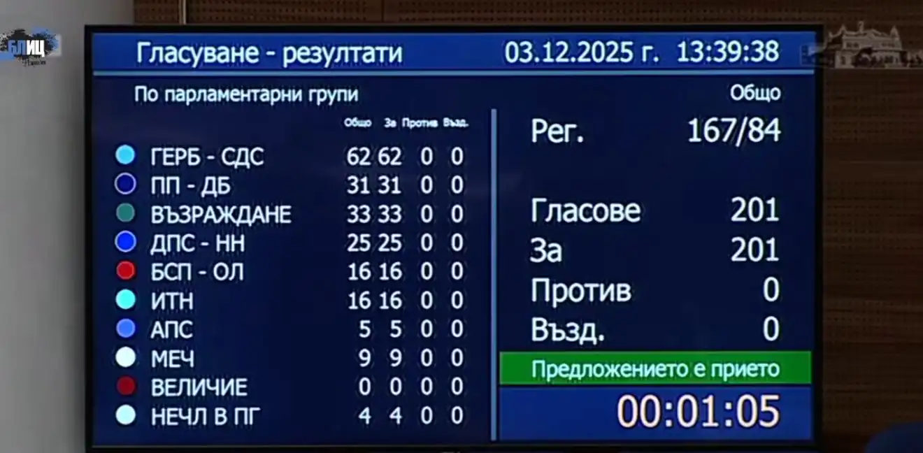 Изтеглянето беше гласувано с пълно единодушие. От 201 гласували го подкрепиха 201 депутати.