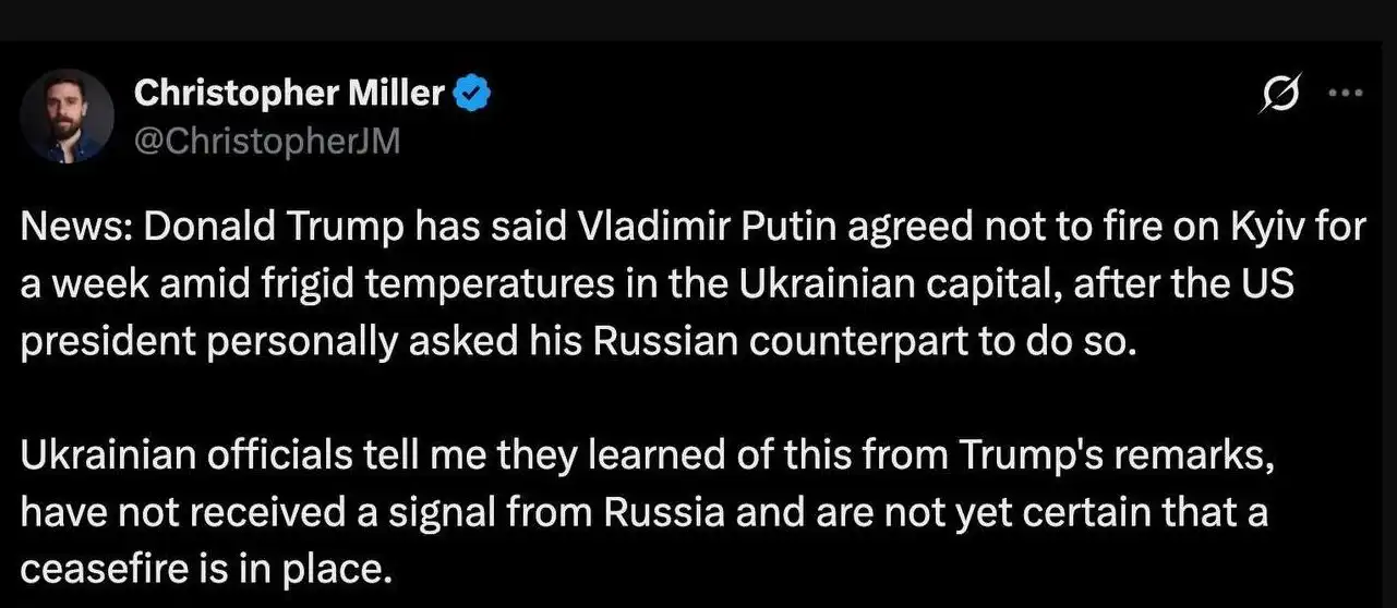 Украинските власти са научили за временното спиране на руските въздушни удари по енергийни обекти само от изявленията на Доналд Тръмп – не са получили сигнал от Русия и още не са сигурни дали такова примирие е в сила, съобщи журналистът на Financial Times Кристофър Милър, позовавайки се на украински официални лица.