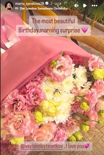 „Обичам те, Ивайло Цветков-Нойзи“, написа Мария под снимка с огромен розов букет, подарък от мъжа й. Поводът е рожденият ден на тв водещата, който е именно днес. Игнатова се похвали в Инстаграм как Нойзи я е събудил рано сутринта с разкошните цветя и не скри, че това е най-голямата изненада за празника й.