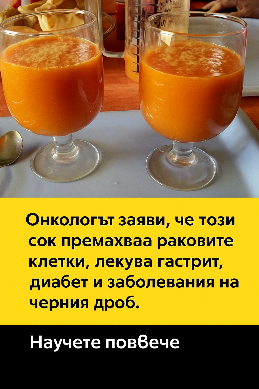 Тази статия има информативен характер. Описаният сок не е лекарствен продукт и не замества професионална медицинска консултация или лечение. Ако имате здравословни проблеми, консултирайте се с квалифициран лекар или диетолог. Редакцията не гарантира резултати и не носи отговорност за евентуални неблагоприятни последици при използването на представената информация.