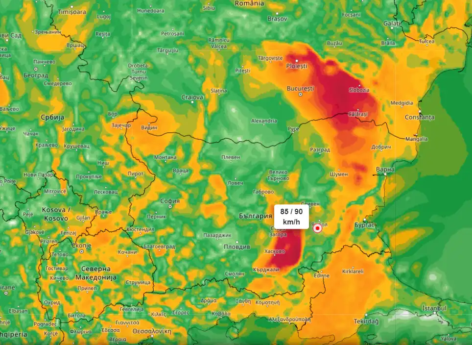 Очакват се ветрове със скорост до 100 км/ч на 31-ти август 2025г. в Югоизточна България.